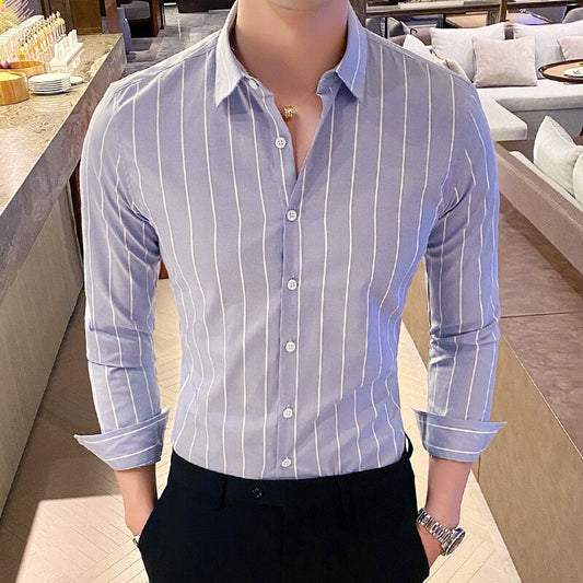 Korea Style Handsome Fashion Shirts Button Down Slim Fit Long Sleeve Striped Shirts