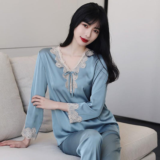 Lace 2PCS Sleepwear Satin Pajamas Suit Summer Pajamas Casual Intimate Lingerie Long Sleeve Shirt Pants Lounge Wear